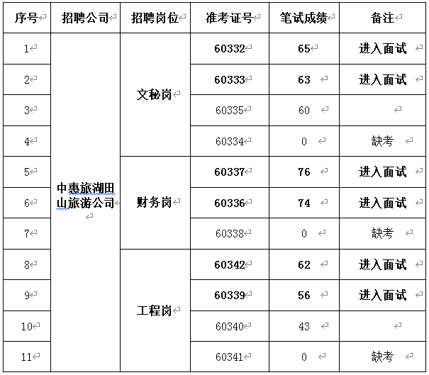 根據《黃山中惠旅湖田山旅游開發(fā)有限公司招聘員工考試公告》,筆試工作已于2019年12月15日上午結束,現將筆試成績及進入面試人員名單公布如下: